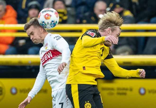 多特蒙德排出343阵型。布兰特、吉拉西和丘库埃梅卡的进攻三叉戟组合联袂出击。瑞尔森、恩梅加、贝林厄姆和拜尔组成4中场。安东、埃姆雷-詹和施洛特贝克3后卫首发出战。科贝尔担任首发门将。多特蒙德首发阵容总身价3.1亿欧元。而斯图加特首发阵容总身价2.22亿欧元。