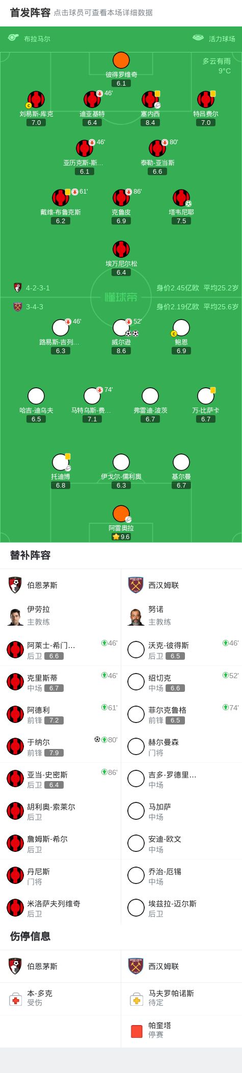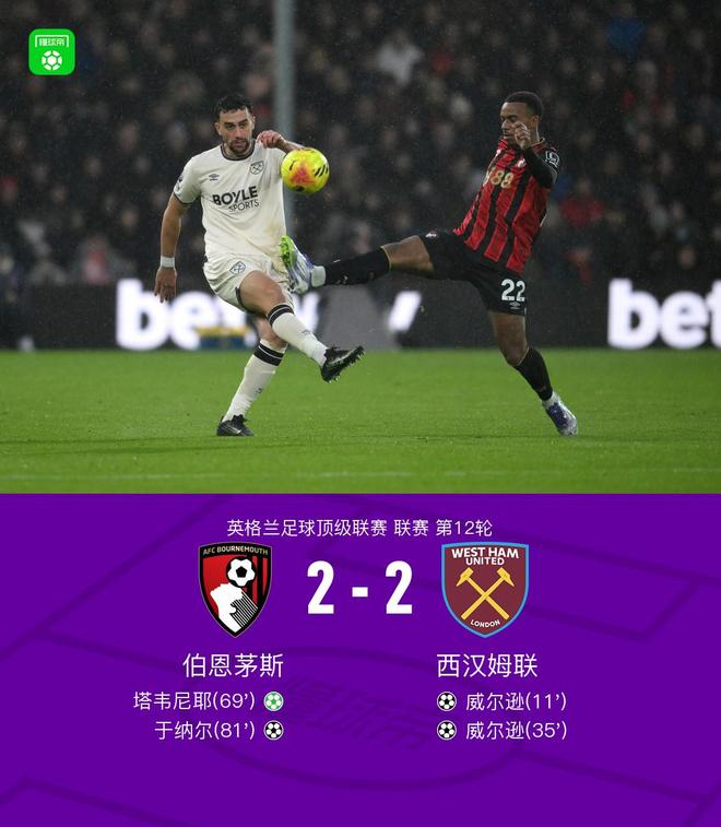 伯恩茅斯2-2西汉姆联,威尔逊双响,于纳尔扳平比分