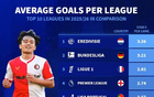 欧洲前10联赛场均进球:荷甲3.36球第1,意甲2.22球垫底